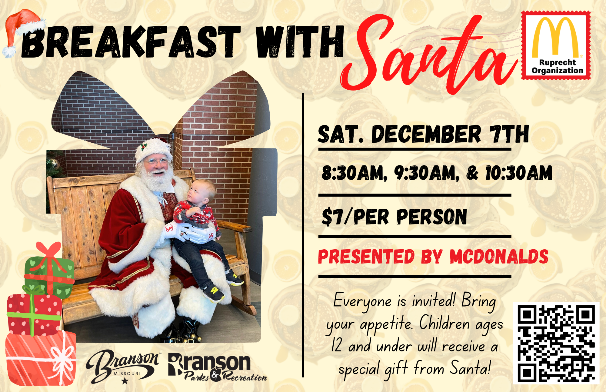 Santa Claus will be making a special stop this year at the Branson RecPlex. Enjoy a delicious breakfast of pancakes and sausage from McDonalds, followed by a visit with Santa. All children age 12 and under will receive a gift from Santa. There will be three sessions available to choose from. Space is limited, so register early!