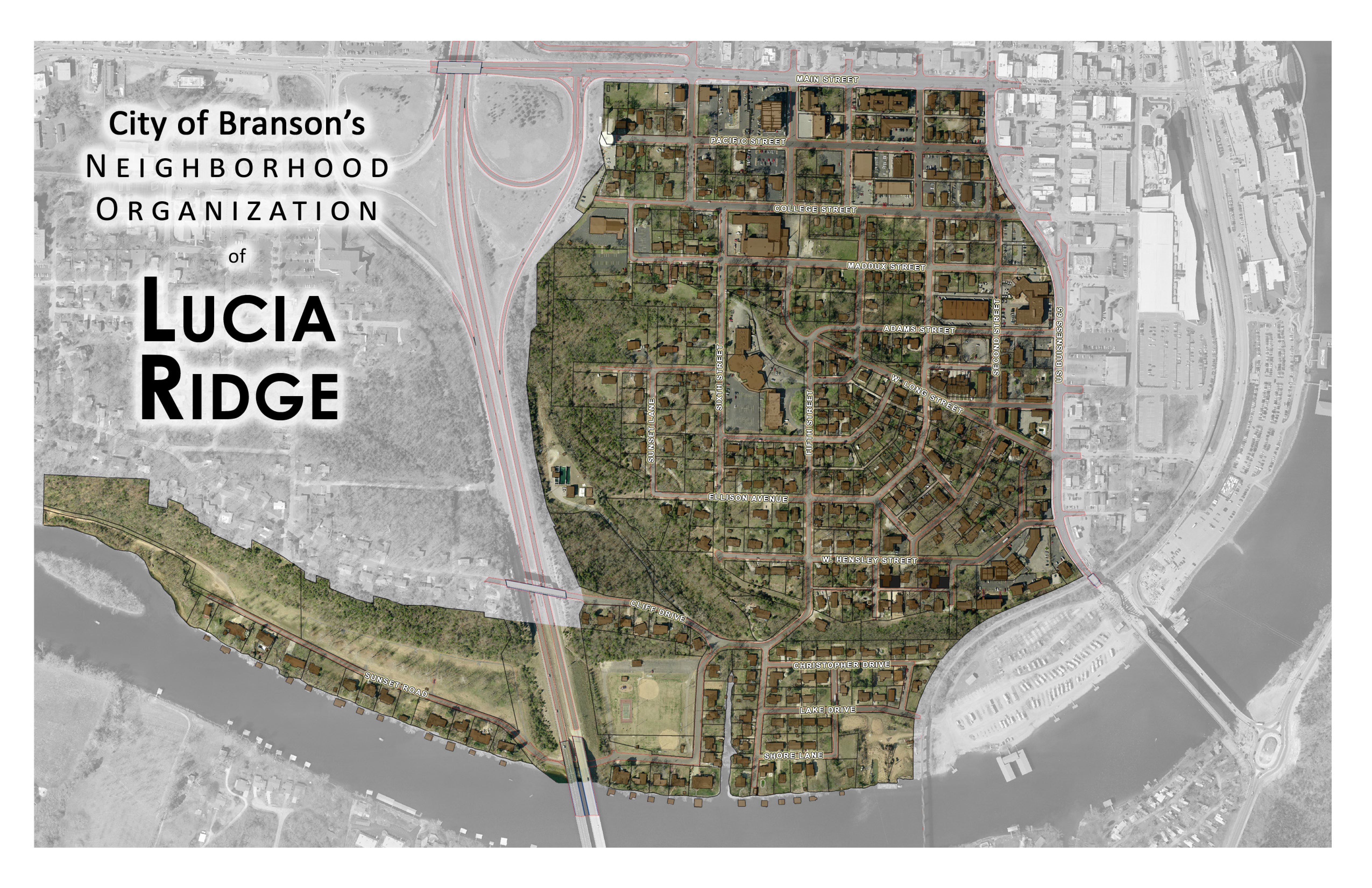 The Lucia Ridge Neighborhood Organization shall cover all land contained within the following boundaries: W. Main Street on the north, Business Highway 65 on the east, Lake Taneycomo on the south, U.S. Highway 65 on the west and Sunset Road west of U.S. Highway 65.